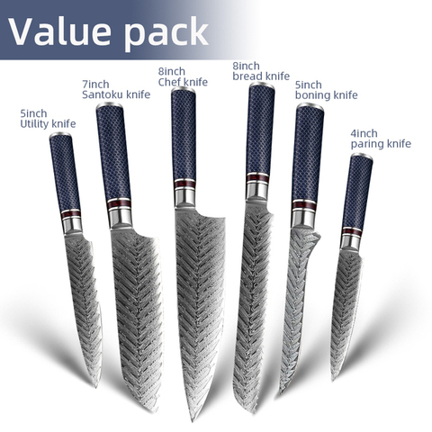 Conjunto de facas de cozinha com lâmina afiada, cabo de madeira de resina azul de aço de damasco vg10